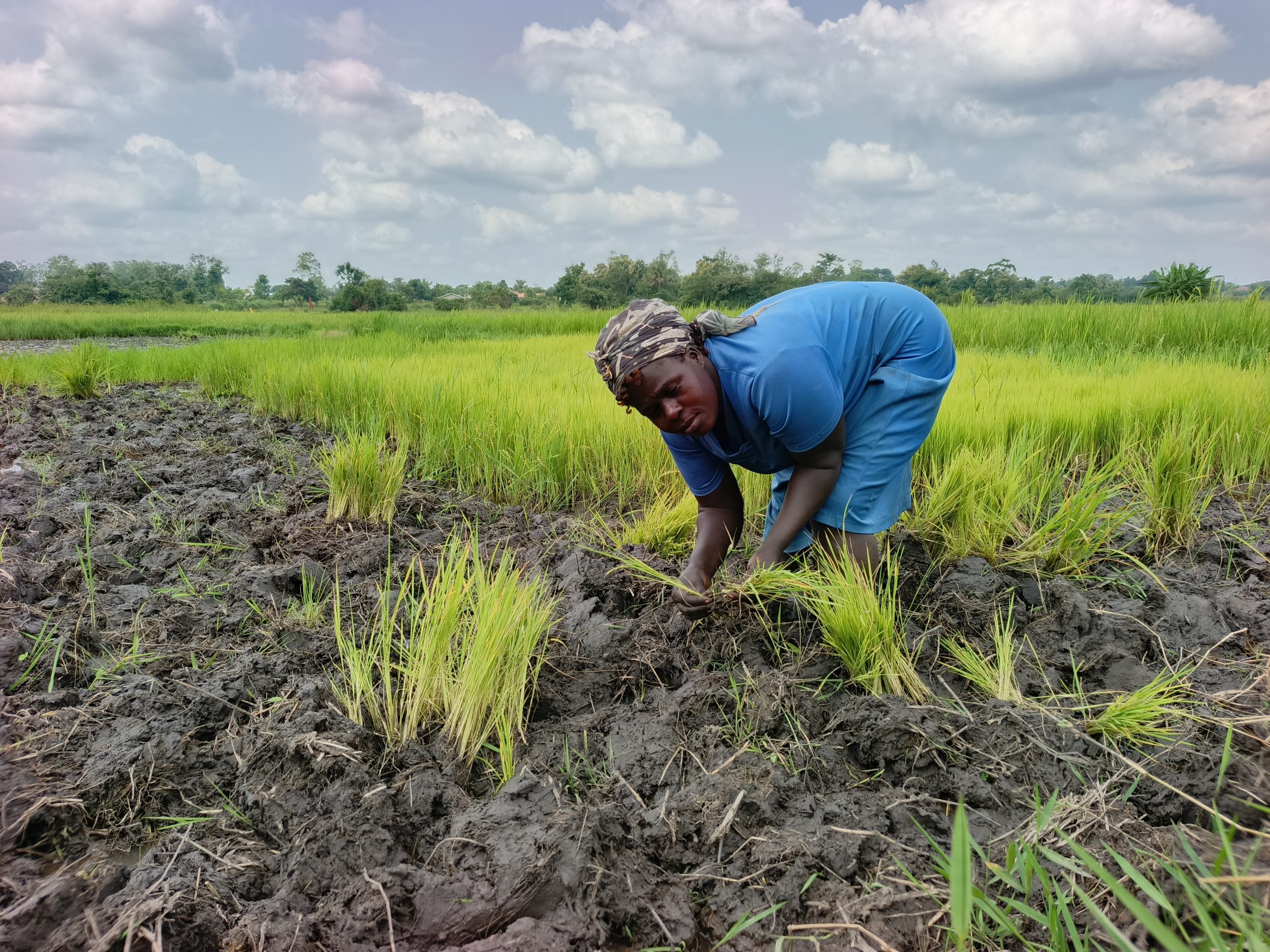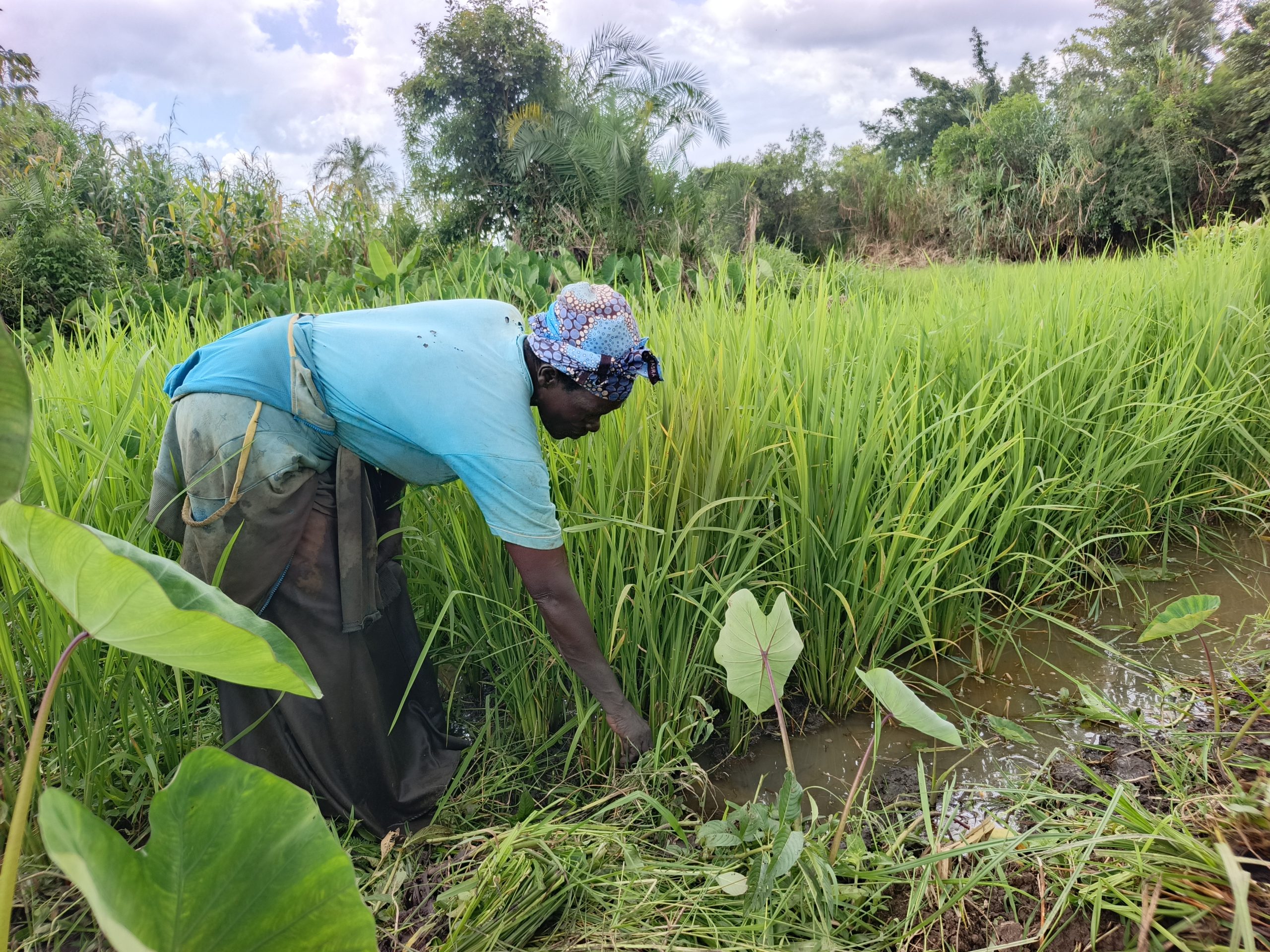Ketty Ogwang weeding her rice (photo by Ambrose Okwanga)